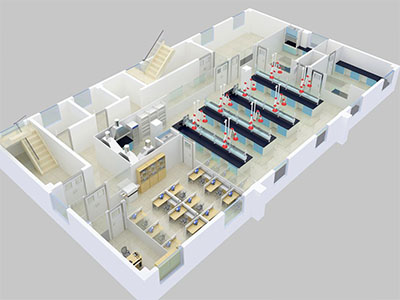 2. 化学分析室 在化学分析室中进行样品的化学处理和分析测定,工作中常使用一些小型的电器设备及各种化学试剂,如操作不慎也具有一定的危险性,针对这些使用特点,在化学分析室设计上应注意以下要求: